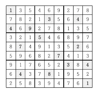 - 굵은 선으로 구분되어 있는 3x3 정사각형 안에도 1부터 9까지의 숫자가 한 번씩만 나타나야 한다.
