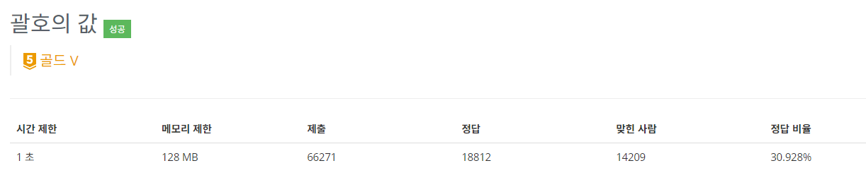- 올바른 괄호열 X와 Y가 결합된 XY의 괄호값은 값(XY)= 값(X)+값(Y) 로 계산된다.