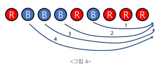 예를 들어, 빨간볼을 모두 왼쪽으로 모으려면, 왼쪽에서 연속된 빨간색 구간은 그래도 두고, 그 뒤에 나오는 모든 빨간색을 이동시켜야 한다.