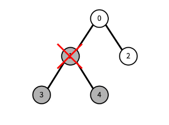 현재 리프 노드의 개수는 3개이다. (초록색 색칠된 노드) 이때, 1번을 지우면, 다음과 같이 변한다. 검정색으로 색칠된 노드가 트리에서 제거된 노드이다.