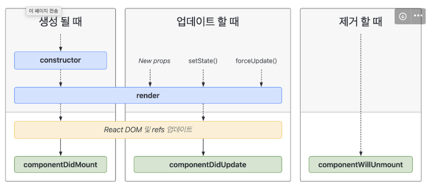 - 업데이트 : props나 state 가 변경되면 렌더가 진행되며 순서대로 호출